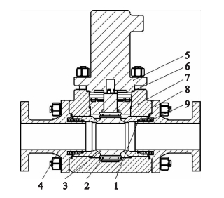 1. Seal rings 2. Thrust bearings 3. Balls 4. Left valve bodies 5. Shielded electric devices 6. Stainless steel graphite wound gaskets 7. Middle valve bodies 8. Right valve bodies 9. Compensation springs