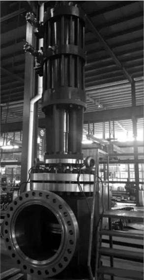 The high-pressure and ultra-high temperature hydraulic control globe valve (the thermal valve, Figure 1) is the key device installed in the hypersonic (M>10) wind tunnel test device. The maximum working pressure of the valve is 12MPa. The nominal diameter is DN500 and the maximum working temperature is 900℃. The medium is high-temperature dry air. According to the working conditions and system requirements, when the valve leaves the factory, in addition to the strength, high pressure seal and low pressure gas seal tests according to API598 standards, the heat insulation test and the matching test of the hydro-cylinder of the actuator and the working pressure and temperature of the medium also need to be carried out. The requirement for the shell thermal insulation test is that when the medium temperature is 900℃, the outer surface temperature of the shell is smaller than or equal to 80℃. According to the requirement for matching between hydro-cylinder and the medium parameters, the medium pressure are 1MPa, 2MPa, 4MPa, 6MPa, 8MPa, 10MPa and 12MPa respectively. There are 7 grades, and the medium temperatures are 505℃, 611℃, 715℃, 809℃and 900℃. The medium pressure is proportional to the cylinder pressure, which is easy to calculate. However, the temperature of the medium will affect the hardness of the seal pair (STL) and the seal pressure of the seal pair will be affected. These data cannot be found in the valve design calculation manual and related documents. Only through tests can we determine the matching relationship between the hydro-cylinder pressure and the media parameters. The pressure of the hydro-cylinder must overcome the acting force of the medium, the necessary sealing of the sealing pair and the friction between the valve stem and the packing. If the pressure of the hydro-cylinder is too high, the sealing surface will be crashed, affecting the service life of the valve. If the pressure of the hydro-cylinder is too low, the sealing pair cannot be sealed and the valve cannot work normally. Therefore, it is very important to select and adjust the hydro-cylinder pressure correctly to achieve a reasonable match.