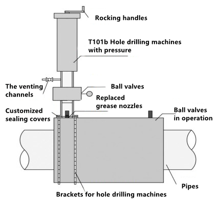 Given the situation that the grease injection nozzle in operation must be replaced in time to deal with the leakage of the grease injection hole, the failed grease injection nozzle can be disassembled and replaced under pressure online by using the T101b hole drilling machines with pressure and its accessories from TDW Company. The hole drilling machine with pressure is fixed on the ball valve and the customized sealing cover at the bottom is used for sealing. The sleeve is used to clamp the grease injection nozzle instead of the hole drilling machine. Use the forward and reverse rotation of the upper and lower cavities of the T101b hole drilling machine with pressure and the rocking handle to realize the assembling of the grease injection nozzle, thereby eliminating the leakage of the grease injection hole (as shown in Figure 2). However, the customized cover plate has poor adaptability and the sealing is very difficult due to the inconsistent working parameters such as specifications and installation positions of ball valves. In addition, the installation process of the grease injection nozzle is based on experience. Once the position is misaligned, the replacement of the grease nozzle under pressure will not be possible.